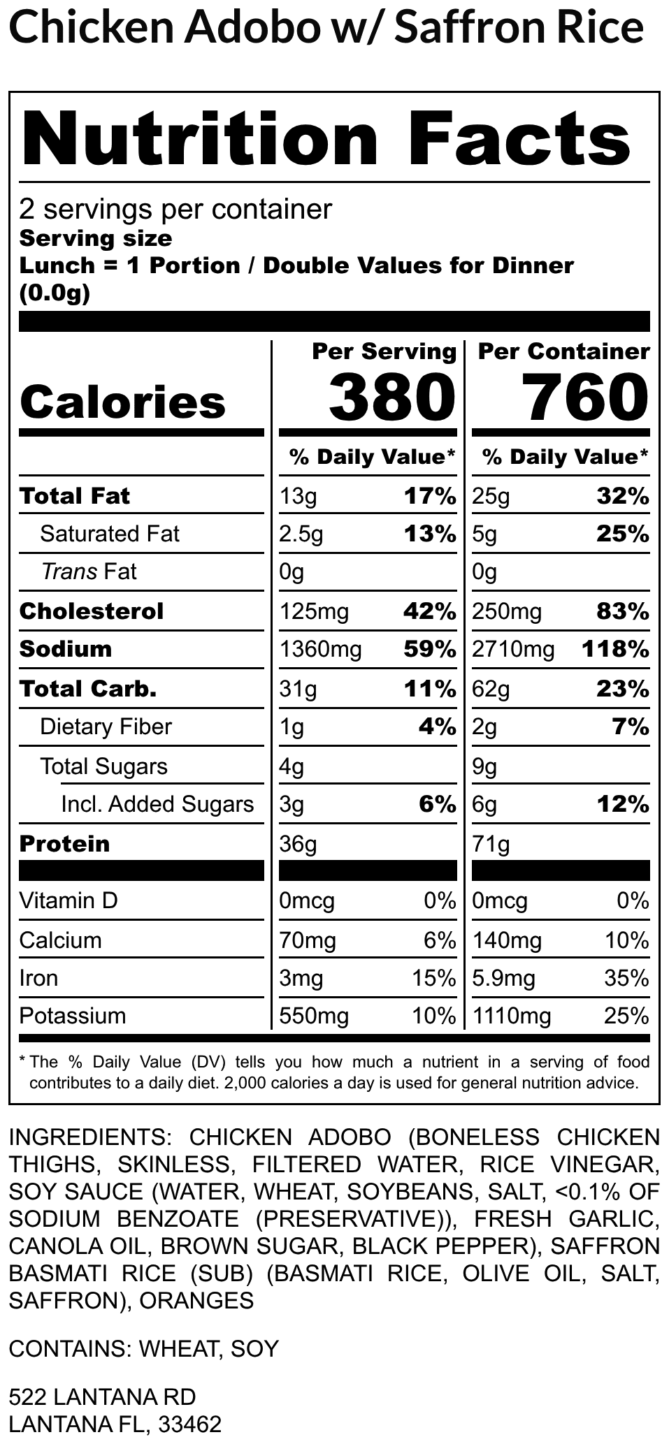 Chicken Adobo (Boneless Chicken Thighs, skinless, Filtered Water, Rice Vinegar, Soy Sauce (WATER, WHEAT, SOYBEANS, SALT, <0.1% OF SODIUM BENZOATE (PRESERVATIVE)), Fresh Garlic, Canola Oil, Brown Sugar, Black Pepper), Saffron Basmati Rice (Sub) (Basmati Rice, Olive Oil, Salt, Saffron), Oranges