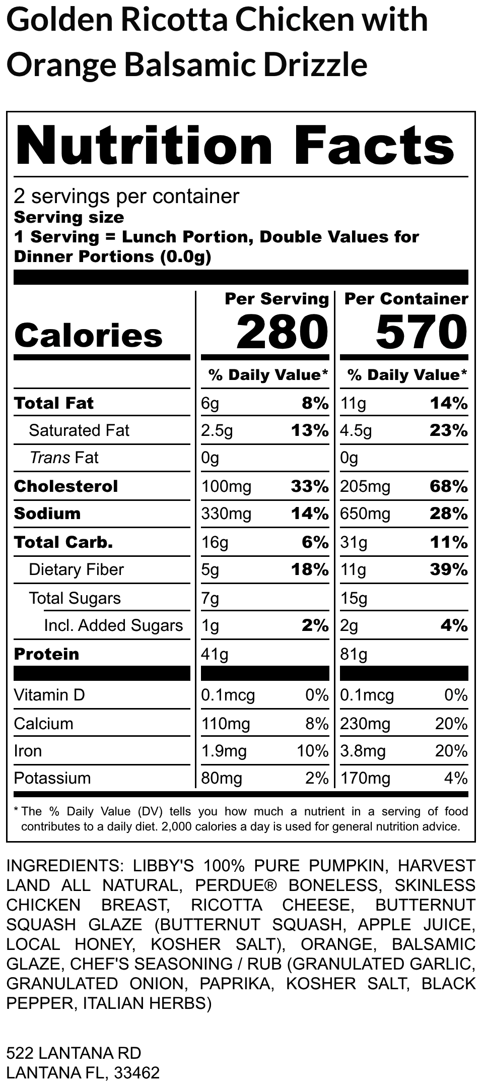 LIBBY’S 100% PURE PUMPKIN, HARVEST LAND ALL NATURAL, PERDUE® BONELESS, SKINLESS CHICKEN BREAST, RICOTTA CHEESE, BUTTERNUT SQUASH GLAZE (BUTTERNUT SQUASH, APPLE JUICE, LOCAL HONEY, KOSHER SALT), ORANGE, BALSAMIC GLAZE, CHEF’S SEASONING / RUB (GRANULATED GARLIC, GRANULATED ONION, PAPRIKA, KOSHER SALT, BLACK PEPPER, ITALIAN HERBS)