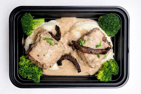 Seared grass-fed beef burgers topped with a hearty mushroom stroganoff sauce and served over roasted garlic mashed potatoes with broccoli. Bold, savory, and built like a steakhouse classic with serious comfort.