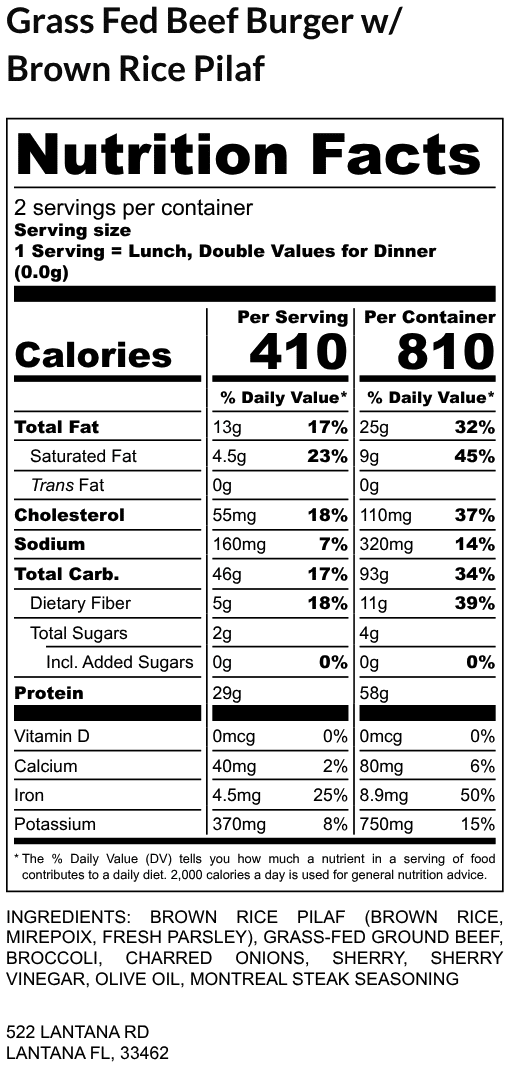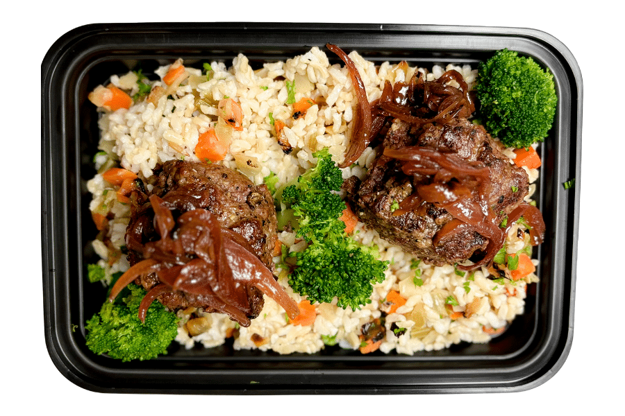 A clean, protein-forward meal made with a juicy grass-fed beef burger, served alongside garlic-herb brown rice pilaf and simply steamed broccoli topped with caramelized sherry onions. Balanced, satisfying, and macro-friendly, this dish is a go-to option for customers focused on performance, recovery, and everyday nutrition. * Option to omit onions