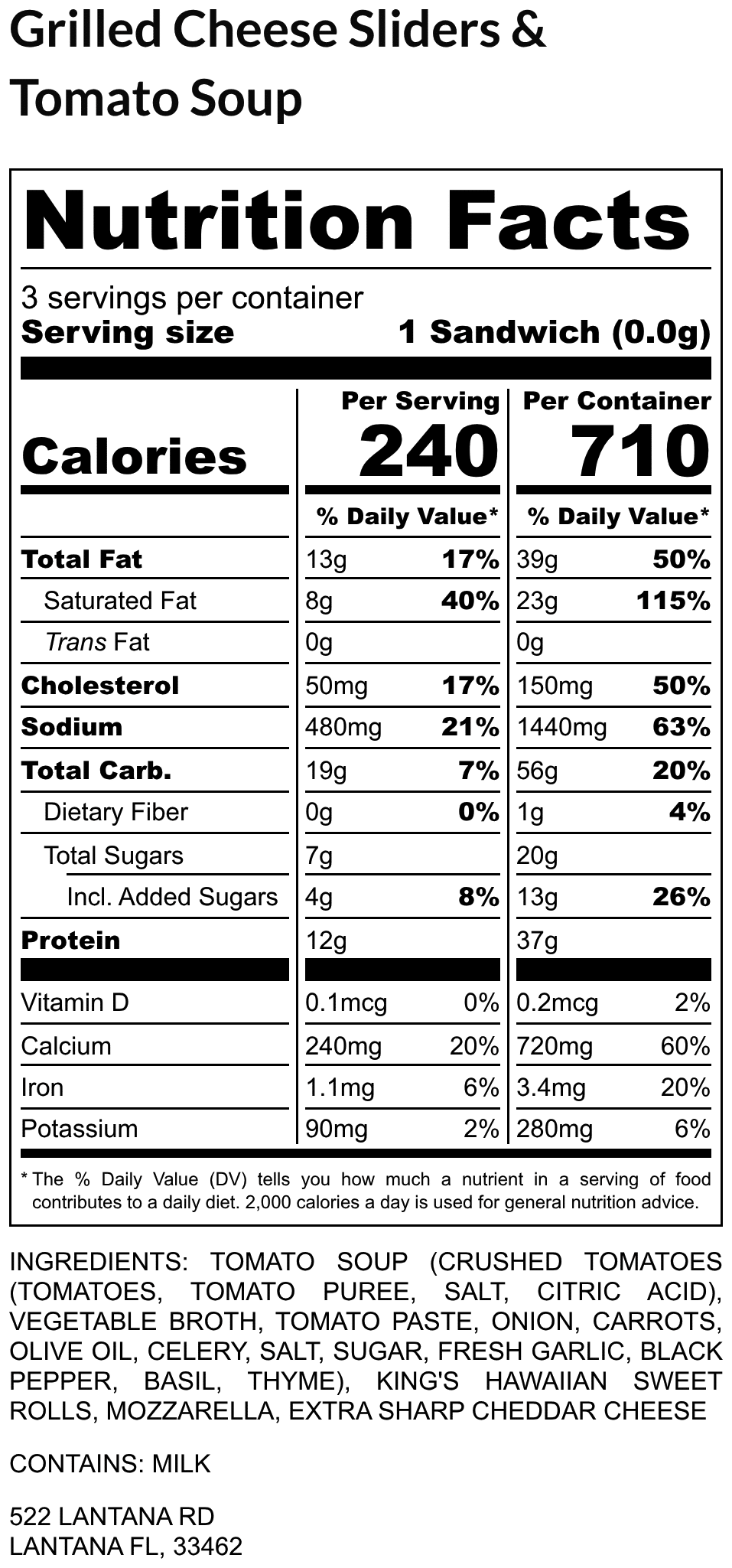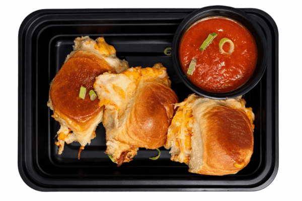 Tomato Soup (Crushed Tomatoes (Tomatoes, Tomato Puree, Salt, Citric Acid), Vegetable Broth, Tomato Paste, Onion, Carrots, Olive Oil, Celery, Salt, Sugar, Fresh Garlic, Black Pepper, Basil, Thyme), King’s Hawaiian Sweet Rolls, Mozzarella, Extra Sharp Cheddar Cheese