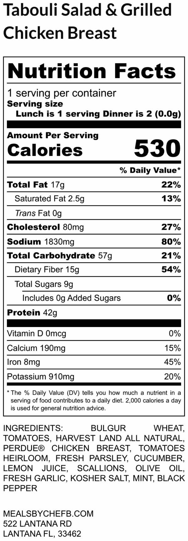 Chef’s Tabouli Salad is A Wonderfully Aromatic Salad of Bulgur Wheat, Fresh Parsley, Mint, Scallions, Tomatoes and Garlic. A Staple in Middle Eastern Cuisine. Topped with Marinated Grilled All Natural Grilled Chicken Breast.