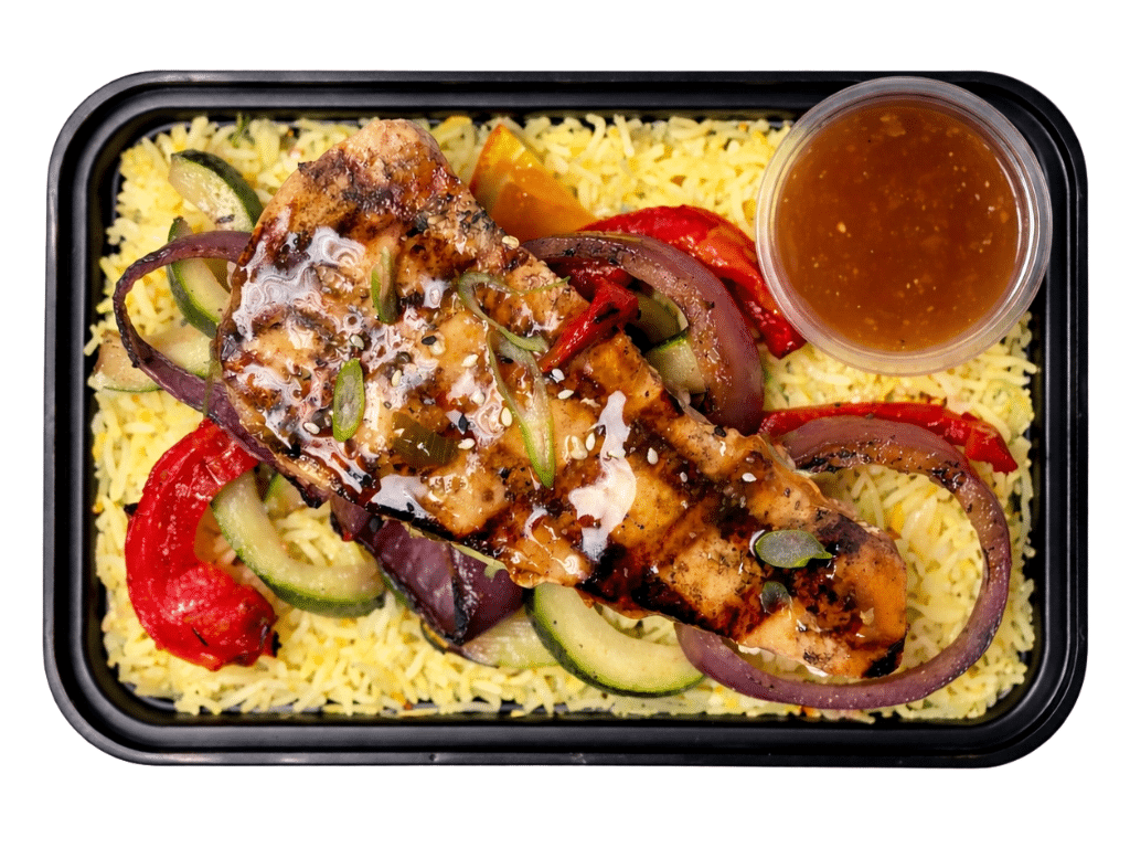 Grilled Marinated Deep Atlantic Swordfish, Served with our Asian Glaze and House Sweet and Tangy Korean BBQ sauce. Finished with Saffron Basmati Rice and Assorted Grilled Veggies.