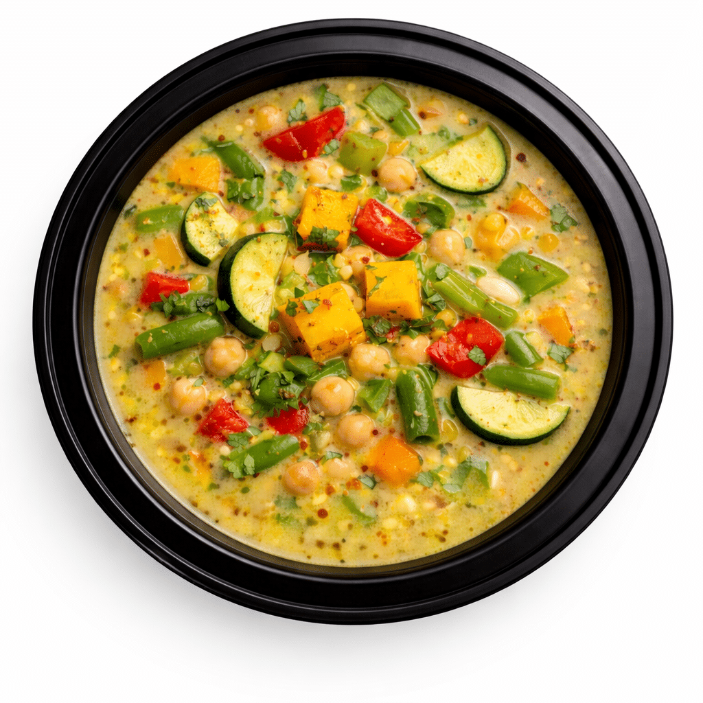 A gently spiced vegetable soup built on turmeric, ginger, and warm curry spices, simmered with coconut milk, chickpeas, and fresh vegetables. Light, aromatic, and layered with subtle heat and brightness from lime and herbs.