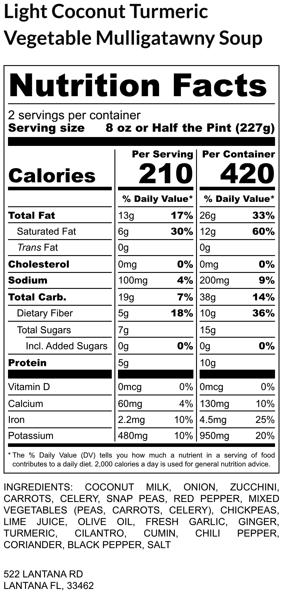 Coconut Milk, Onion, Zucchini, Carrots, Celery, Snap Peas, Red Pepper, Mixed Vegetables (Peas, Carrots, celery), Chickpeas, Lime Juice, Olive Oil, Fresh Garlic, Ginger, Turmeric, Cilantro, Cumin, Chili Pepper, Coriander, Black Pepper, Salt