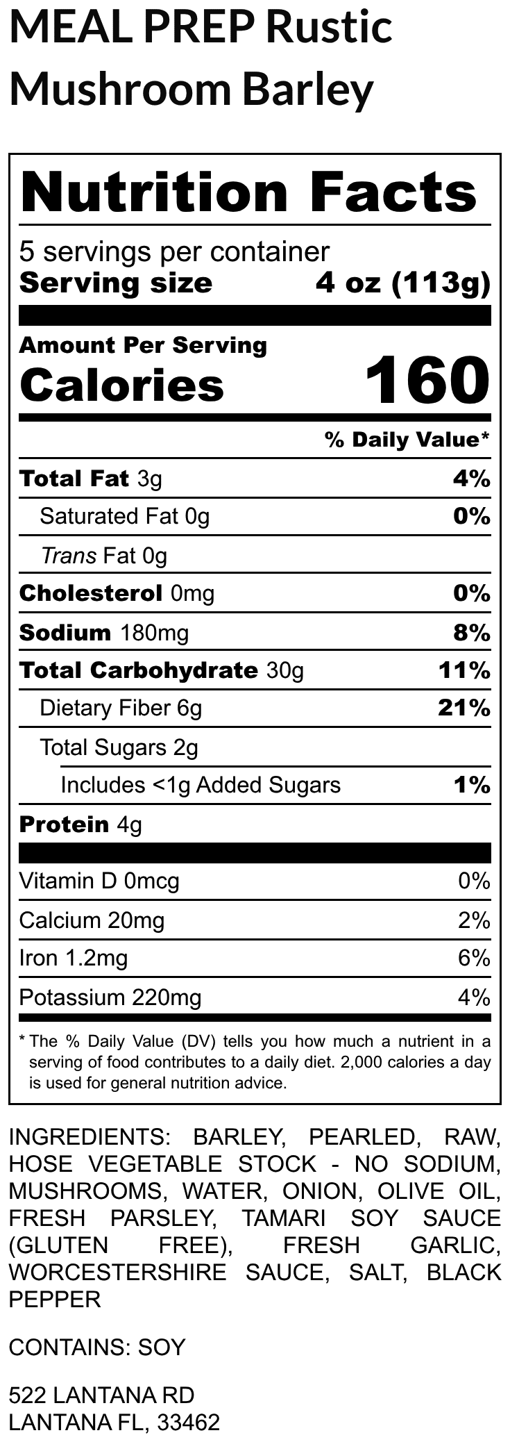 Barley, pearled, raw, Hose Vegetable Stock – No Sodium, Mushrooms, Water, Onion, Olive Oil, Fresh Parsley, Tamari Soy Sauce (Gluten Free), Fresh Garlic, Worcestershire Sauce, Salt, Black Pepper