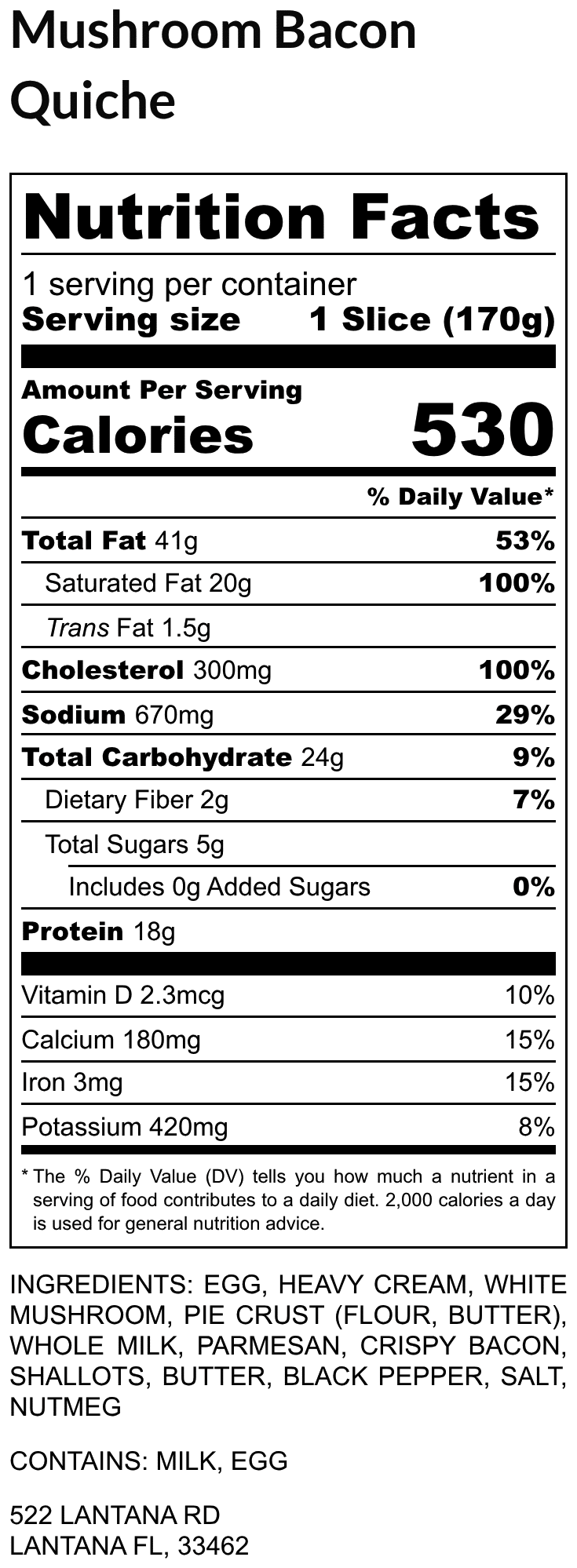 Ingredients: Egg, Heavy Cream, White Mushroom, Pie crust (Flour, Butter), Whole Milk, Parmesan, Crispy Bacon, Shallots, Butter, Black Pepper, Salt, Nutmeg