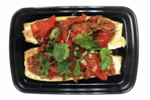 Fresh Zucchini, Stuffed with Our Taco Seasoned Lean Ground Turkey, Roasted and Caramelized in the Oven, Fresh Cilantro and Roasted Pepper Garnish