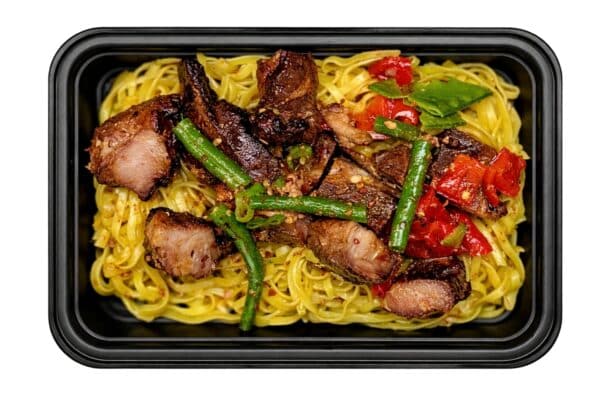 Pork Adobo (Pork, Filtered Water, Soy Sauce (WATER, WHEAT, SOYBEANS, SALT, <0.1% OF SODIUM BENZOATE (PRESERVATIVE)), Rice Vinegar, Fresh Garlic, Canola Oil, Brown Sugar, Black Pepper), Rice Noodles, Green Beans, Peppers, sweet, red, Turmeric