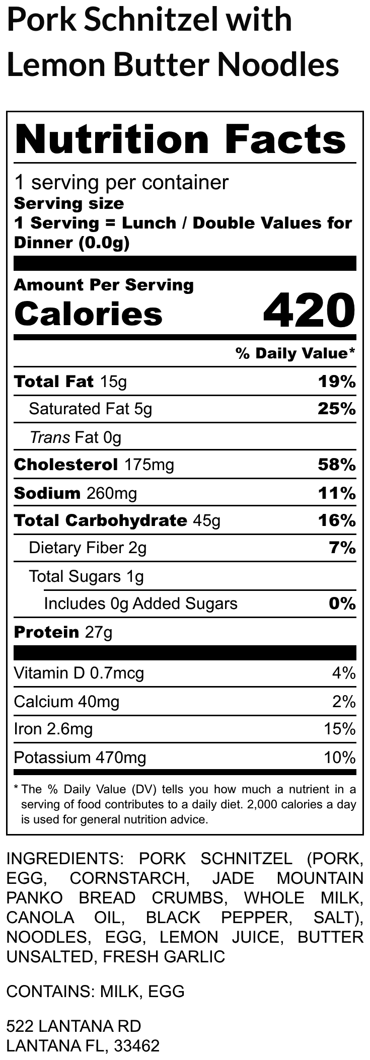 Pork Schnitzel(Pork- Boneless, Skinless, Egg, Cornstarch, Jade Mountain Panko Bread Crumbs, Whole Milk, Canola Oil, Black Pepper, Salt), Noodles, egg, Lemon Juice, Butter unsalted, Fresh Garlic