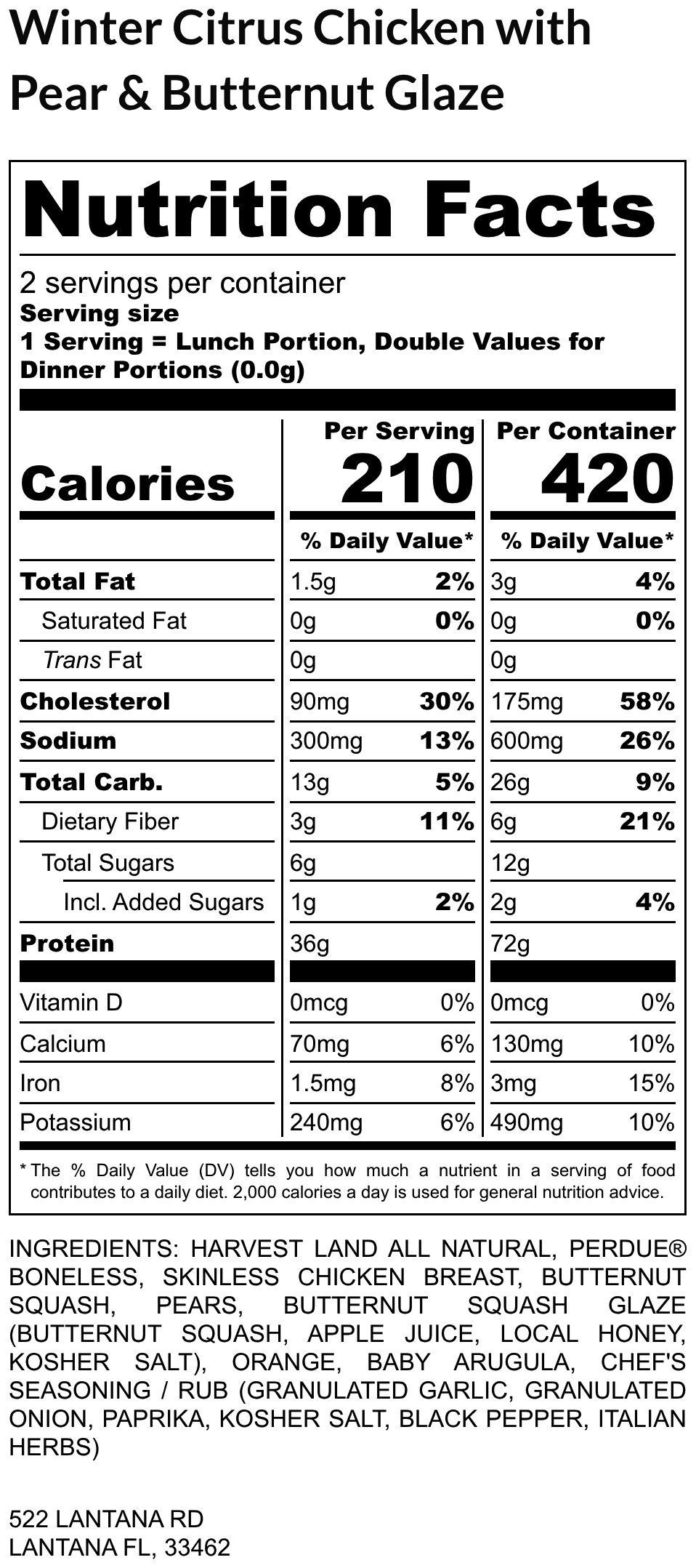 HARVEST LAND ALL NATURAL, PERDUE® BONELESS, SKINLESS CHICKEN BREAST, BUTTERNUT SQUASH, PEARS, BUTTERNUT SQUASH GLAZE (BUTTERNUT SQUASH, APPLE JUICE, LOCAL HONEY, KOSHER SALT), ORANGE, BABY ARUGULA, CHEF’S SEASONING / RUB (GRANULATED GARLIC, GRANULATED ONION, PAPRIKA, KOSHER SALT, BLACK PEPPER, ITALIAN HERBS)